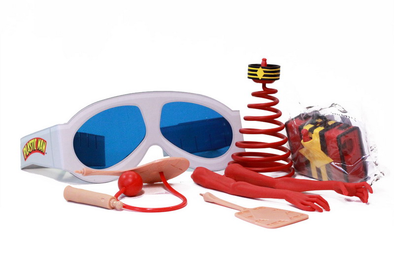 For this year's San Diego Comic-Con, Mattel whipped up a fine exclusive for the world of DC Universe Classics: Plastic Man. Priced at only $20, this is actually a great buy considering all the bonus accessories that they've included. And if you actually got yours while at Comic-Con, there's a bonus accessory thrown in for absolutely no extra cost. Last year's SDCC exclusive were the Wonder Twins and Gleek, also characters who were able to change forms.