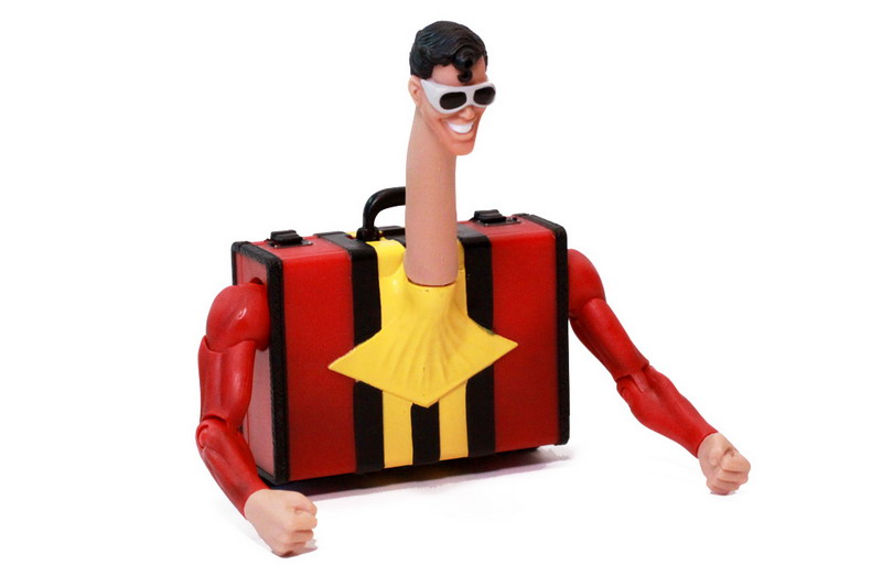 There's more than just extra limbs for Plastic Man, there's an extra long neck joint as well as a springy lower torso. The SDCC exclusive accessory is a suit-case accessory where arms and head can be attached. The suitcase opens up to reveal three small comics printed on cardstock. This is a great accessory as a freebie but it's definitely a bummer for those unable to make the convention.