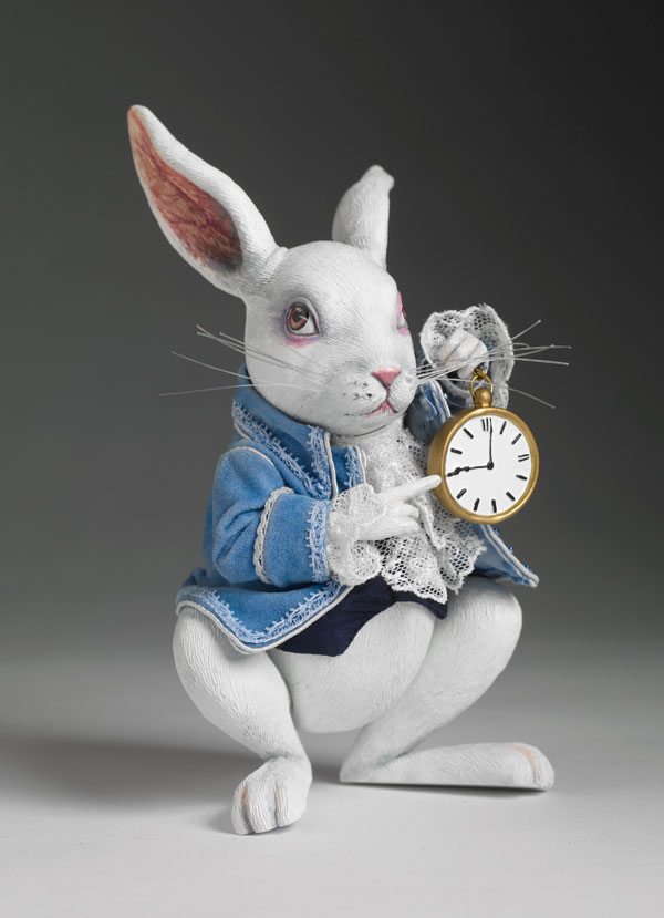 This approximately 7-inch tall white rabbit comes dressed in crisp blue vest under a soft velveteen jacket with lace collar and cuffs. His essential timepiece is also included.