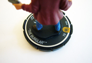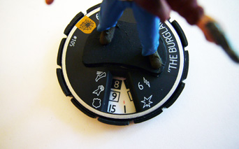 “The Burglar” #105 is a repaint of the Mugger #006 figure, sharing his classic “up to no good” appearance. Wielding a pistol to commit his crimes, the Burglar wears blue pants, black belt, a white shirt, red jacket, and dark brown cap. Noticeably, his pistol is silver while the Mugger’s is black. Carradine clocks in at 19 points (kept slim by no affiliation or keywords), just slightly over the Mugger’s 16. For that cost the LE figure actually has a shorter dial with only three clicks of life. But, he’s got better Speed and Attack numbers, not to mention an additional Special Power granting a whopping +2 to damage against characters with a lower point cost. Add that to his Stealth and Running Shot and you’ve got a criminal literally designed to go after your opponent’s weakest teammates.