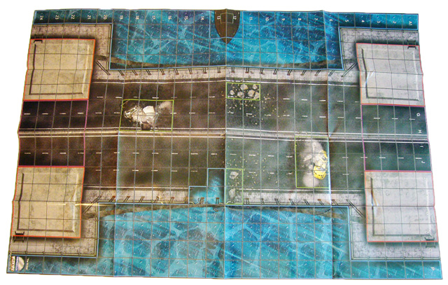 While not explicitly any one specific bridge, the Web of Spider-Man Bridge map has all of the elements of a typical structure. Tall towers flank a long road running across a span of water. In HeroClix, this translates into a very cool game environment! Each side has a distinctive square 4x4 Starting Area, both of which are nestled between identical 4x4 elevated terrain (with ladders on their far sides). On the bridge are four blocks of hindering terrain representing smashed cars and rubble. Finally, there’s plenty of water and even a small boat providing standard terrain near the edge!