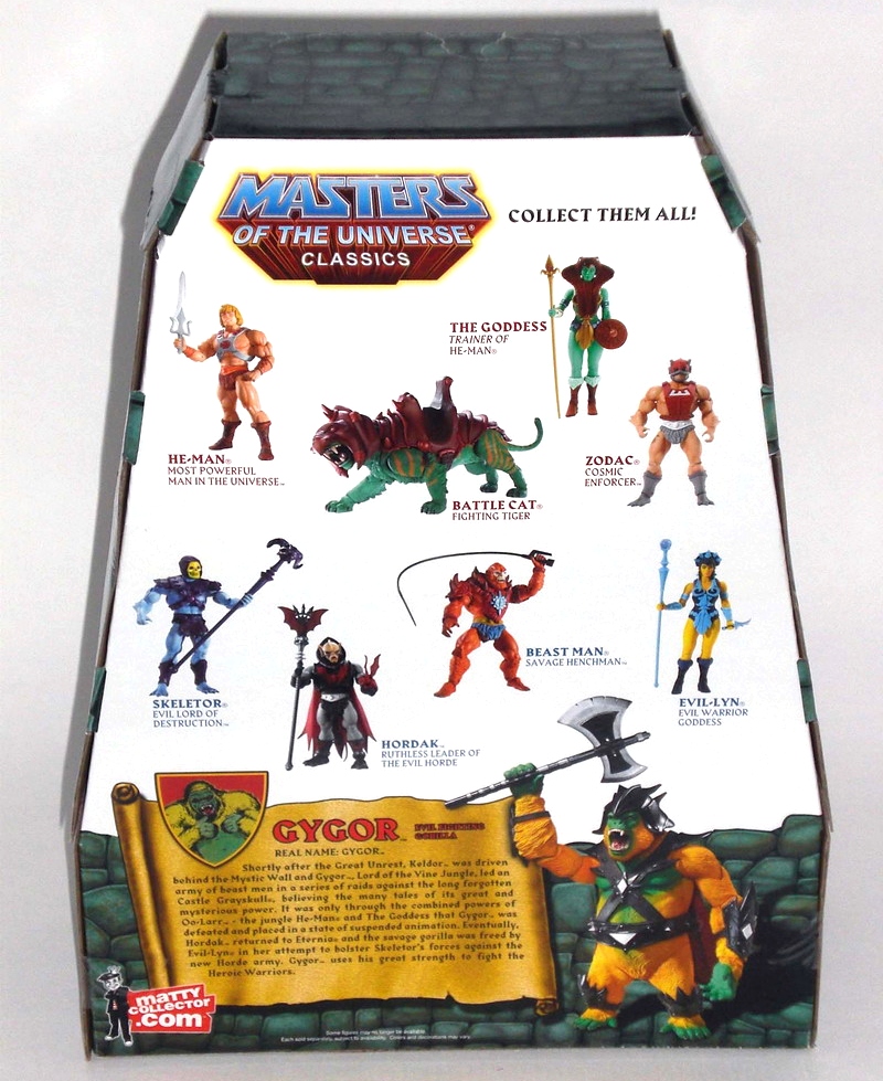 The back of the box features several different past figure releases and Gygor's character bio. The latter reveals new details about Eternian lore and the ape creature's background. One thing to note: When opening the package, it is only necessary to open one side to slide out the cardboard tray and remove the figure.