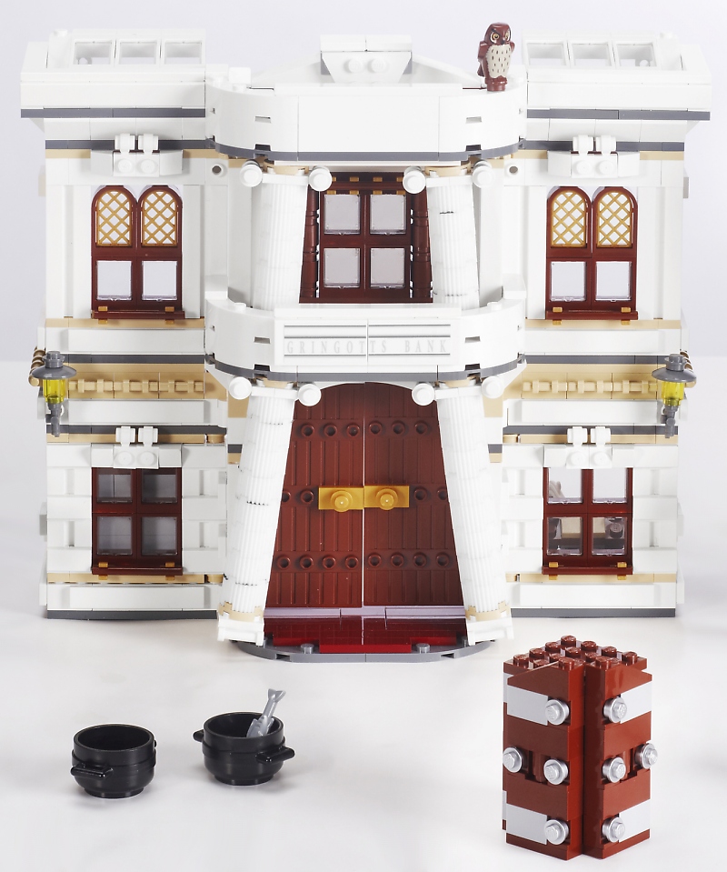 Gringotts Bank is an impressive two-story building with large double doors, and can be opened completely into one large building or closed to create one smaller building. The bank's interior features a removable vault, along with the Philosopher's Stone, a clerk's desk, a chandelier and 'wonky' support pillars. Gringotts Bank measures 8" (21 cm) high and 4" (10 cm) wide when closed, 8" high and 9" (23 cm) wide when opened wide.