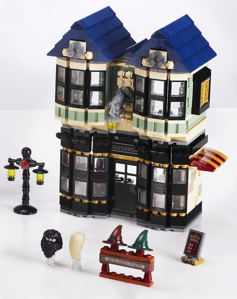 Diagon Alley includes 11 minifigures: Harry Potter, Ron Weasley and Hermione Granger, each with magic wand; Rubeus Hagrid, equipped with his pink umbrella; Fred and George Weasley; 2 Gringotts goblins; Mr. Ollivander; Lucius Malfoy (with Death Eater disguise); Fenrir Greyback; and 4 new, decorated owls.