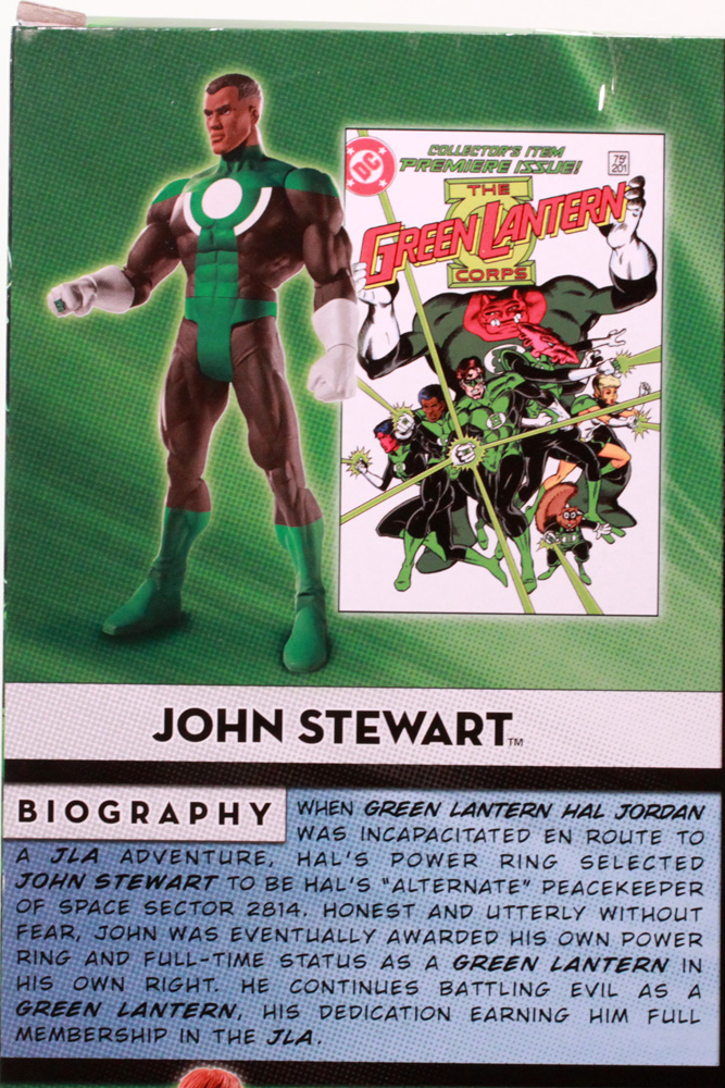The sides of the box have the typical lineup of characters who have been made into DCUC figures, all in a green cast. The back of the box is a big improvement over similar products. Instead of a lot of background imagery or boring graphics, the panel is divided into five sections. Each Lantern has a photo of his figure, a relevant comic book cover, and a fairly in-depth biography. Frankly, it's a great package design and hopefully we'll see more like it from Mattel.