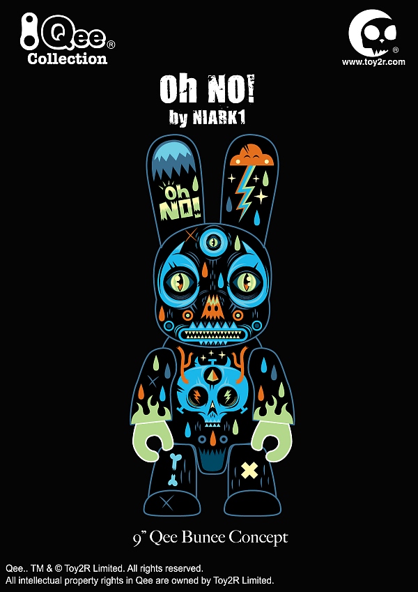 Paris, France has given birth to a lot of great artists and Niark1 is one of those to be recognized as original and awe inspiring. Toy2R first saw one of his customs at an exhibit and was blown away by the use of color and detailed simplicity. Recreating one of his original customs - Oh No! 9" Bunee will be the first 9" Designer Bunee Qee released for 2010. Limited to 500 pieces worldwide.