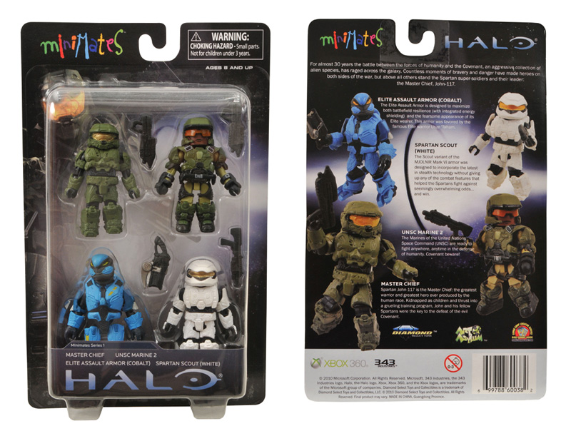 Earlier this week we showed you the upcoming Toys R Us exclusive HALO Reach Minimates 2-packs (see the story here). Well, there's even more HALO goodness on the way! Next up is a HALO Minimates 4-pack that you'll find in specialty shops with Master Chief, UNSC Marine 2, Elite Assault Armor (Cobalt), and Spartan Scout (White).