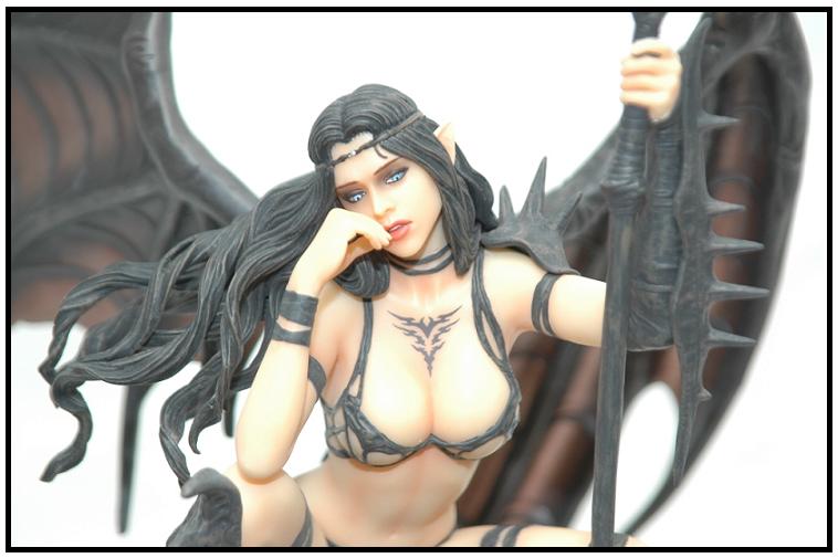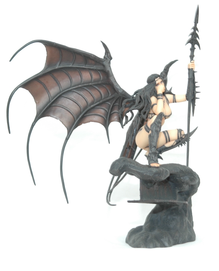 Sculptor Shin Tanabe brings Luis Royo's gorgeous painting to life with skill and artistry. The intricate details seen in the painting - the translucent demonic wings, the massive base, the inquisitive and thought-provoking look upon her face - all are present and captured in this polyresin statue.