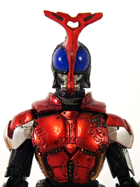 Remember the main colors from the Rider’s box? Those are in full effect on the figure from the black suit subtly lined in purple to the bright metallic reds and silvers of the armored components. Many of those hues are re-used in detail work as well as vivid yellow on the breastplate and belt. Especially striking for its single use is the powerful blue of Kabuto’s huge beetle “eyes.”