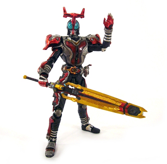 Without delving too far into the Kamen Rider mythology, each hero has various forms and specific equipment for each. It’s just so with Kabuto, whose basic form wields a dagger and a gun that transforms into an axe. Swapping out a couple of parts turns him into his “Decade” version that also has its own weapon: a sword/gun/book. This form’s belt is much smoother with a large silver “buckle” decorated with red spheres. The alternate head (that’s used in most of the other forms as well) is an upgrade with green “eyes” and larger horn, which is easy to replace on the neck ball joint.