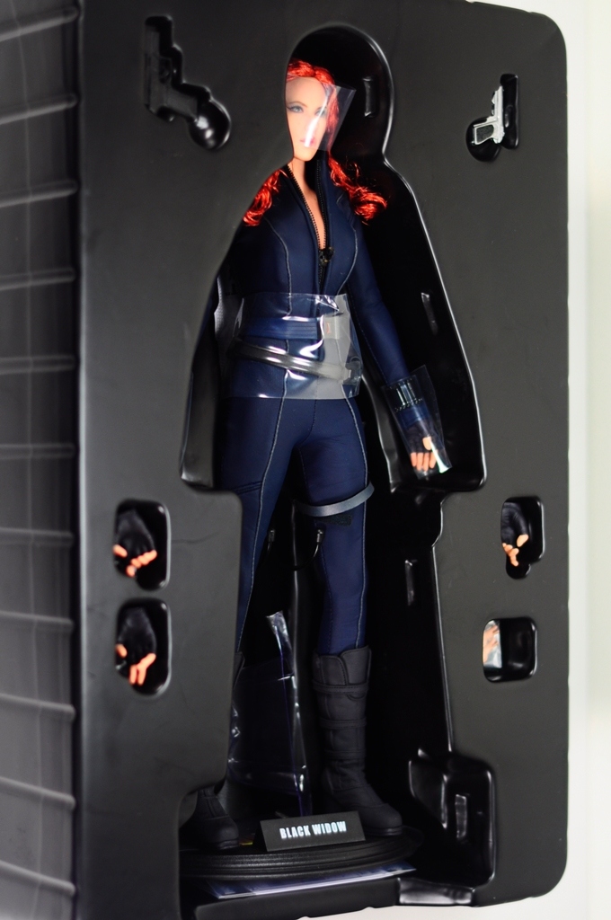 PACKAGING: While some of the other Iron Man and Iron Man 2 figures feature super detailed and attractive packaging, this figure features some of the simplest packaging design. The slipcase features a metallic image Scarlet Johansson's portrait printed on the box as well as the series logo/name. As with other Hot Toys packaging, one pulls the interior box out to find the window box through which the figure and parts are clearly visible.
