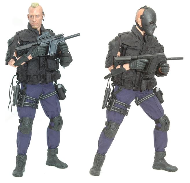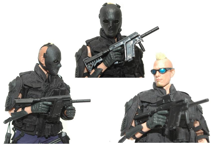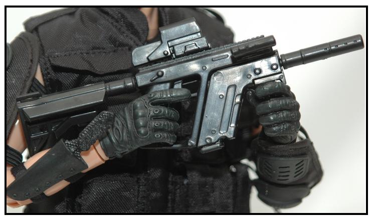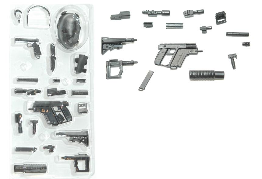 Last, but certainly not least, the weapons. The G4H pistol is well made, features a removable clip as well as form-fitting right leg holster. However, the star of the show is the ATAC Modular Submachine Gun, which features a variety of interchangeable parts and pieces (below) which allow it to take on a variety of forums for a variety of purposes.