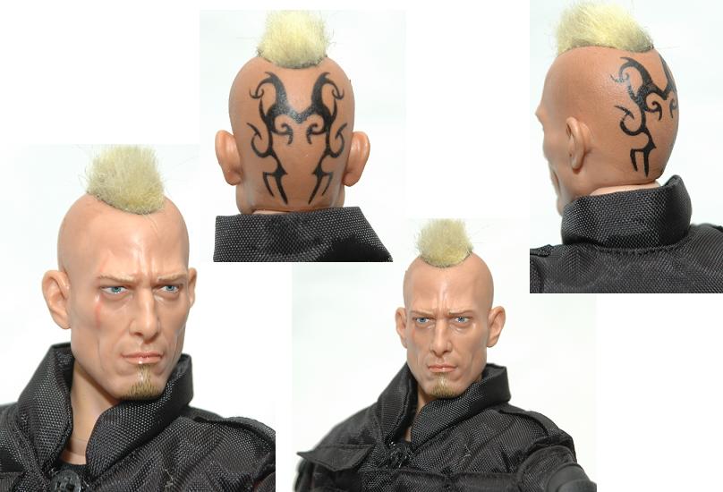 Tyrus' head sculpt (above) is very impressive, featuring a well-sculpted face with high cheekbones, a solid jawline, and tight-looking eyes. The bald head features a mohawk made of faux blonde hair which should impress fans of this look. Likewise, the character features a scar aside his right eye. Overall, a unique and somewhat original head sculpt that'll impress collectors.