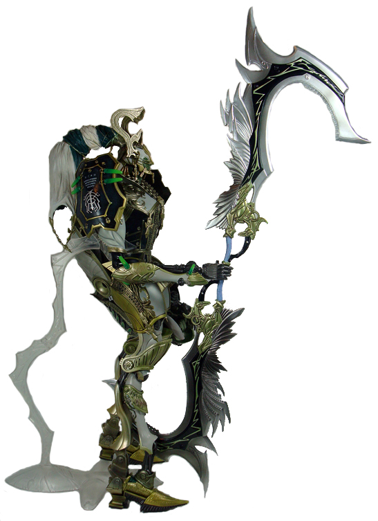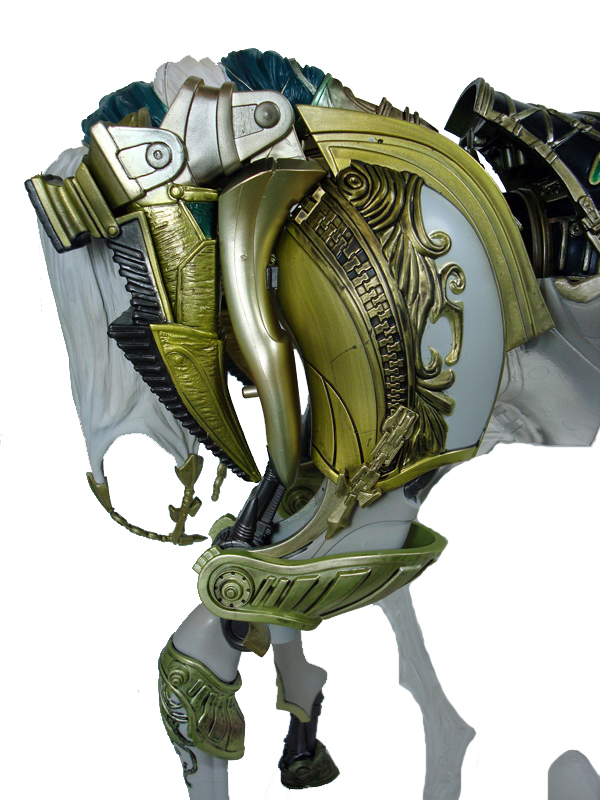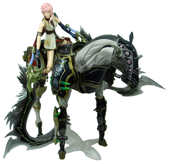 The powerful Odin summon has appeared in almost every Final Fantasy game released since Final Fantasy 3, and his appearance hasn’t changed much in all of that time, even if the method in calling him to battle has. But in the newest FF game, Final Fantasy 13, Odin is given a major overhaul as part of the new combat system, including a bold new look. Now referred to as an Eidolon, Odin must be defeated in battle before becoming the lead character Lightning’s exclusive summon. Odin first appears in a humanoid form wielding his massive double-ended Zantetsuken sword, which in older games was always the case, but he was also astride a mighty steed. The surprise comes when the player activates the Gestalt mode and a secondary form takes place as Odin himself transforms into a horse for Lightning to mount as she splits his sword into two massive scythe blades to use on enemies. The new Odin is now realized in a fully-transformable, highly-detailed action figure in Square-Enix’s FFXIII Play Arts Kai series.