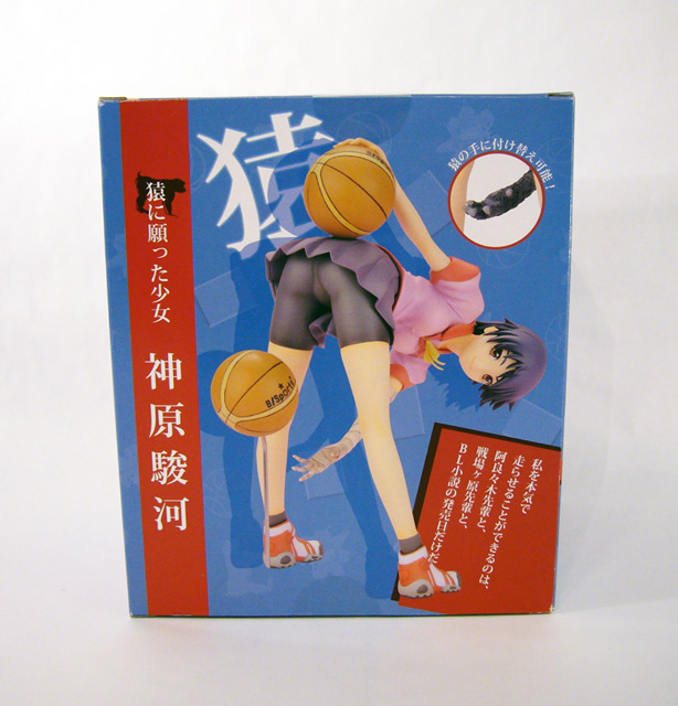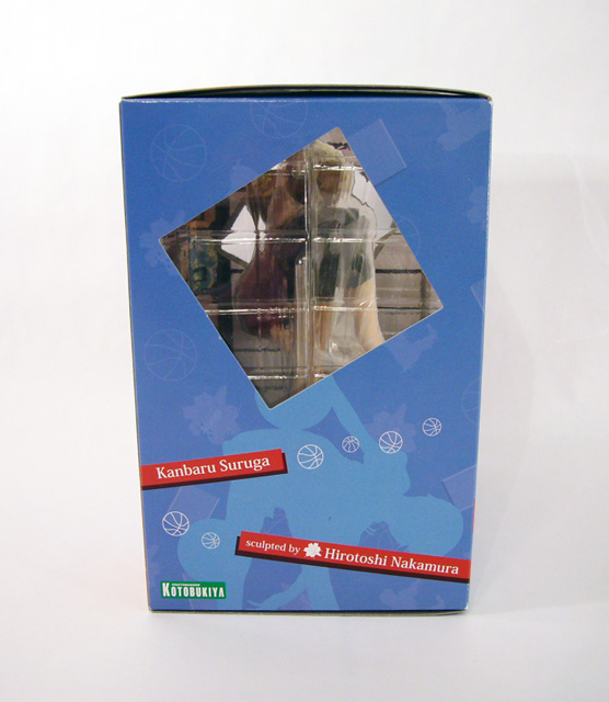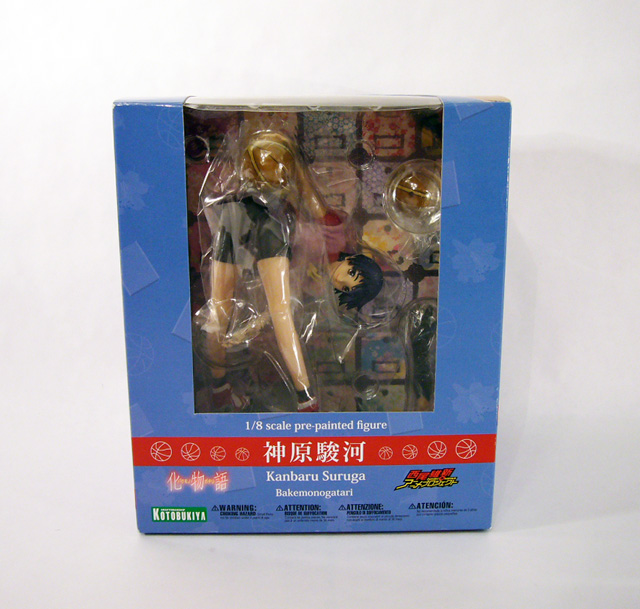 The Bakemonogatari girls come packaged in standard Koto window boxes with plenty of decoration. In Kanbaru’s case, the box is a light blue with a background pattern of symbols including a silhouette of the statue, basketballs, and more. The front panel is dominated by the large window, and underneath it is the character’s name and that of the series. The top of the box has a partial photo of the statue, while the back panel has a clear image of the whole piece and an insert of one of the special features. There’s also plenty of Japanese text covering the package, but unfortunately I couldn’t tell you what it says!