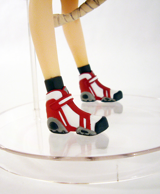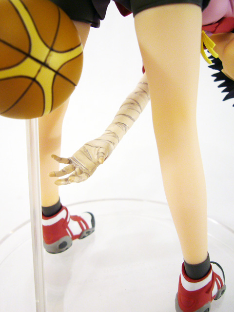 The high school girl wears a decidedly cute outfit with a pink and red shirt, gray skort (half skirt, half shorts), and basketball shoes in red, gray, and white. Kanbaru’s sculpt focuses on intricate clothing details like the pleats on her skirt and the tiny tie at her neck, while emphasizing smoothness on the long lines of her exposed limbs. The girl’s short hair is spiky and yet flows with her awkward pose, and her basketball shoes are quite detailed. Of course, her arms really stand out with regards to sculpt, both the tightly wrapped one and the monkey version.