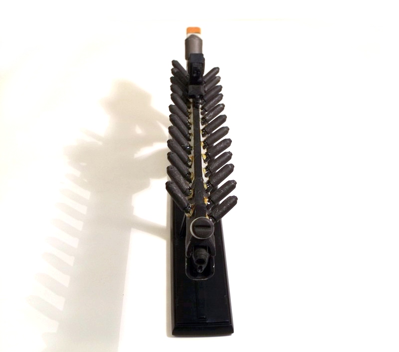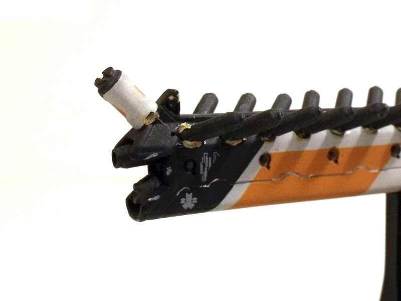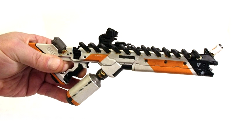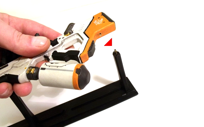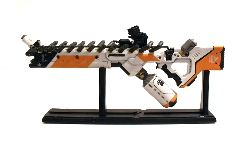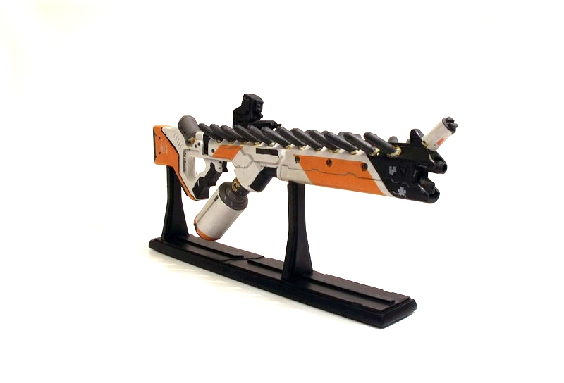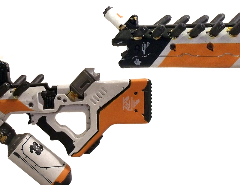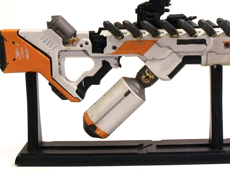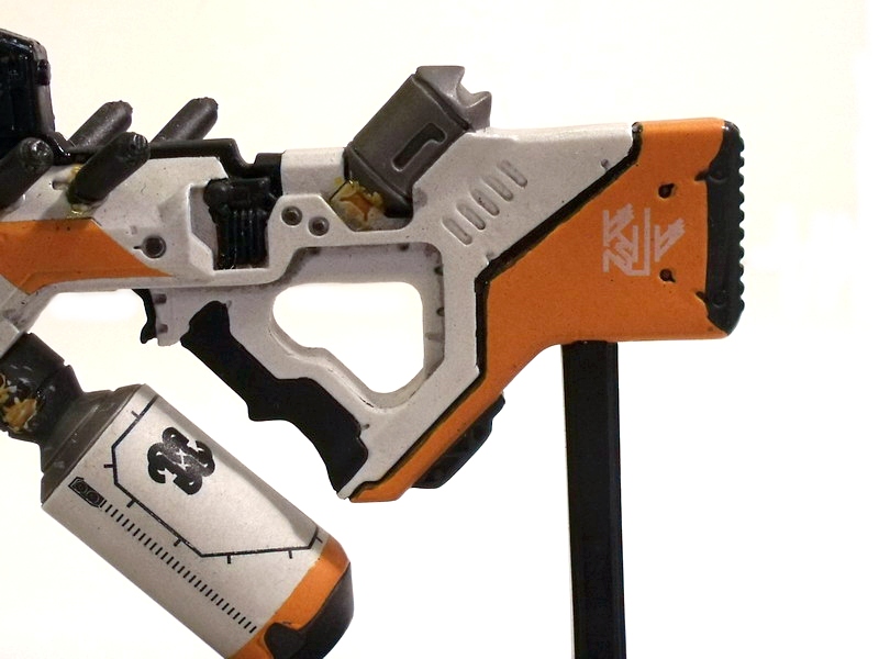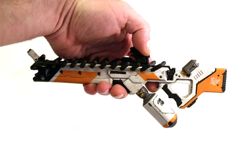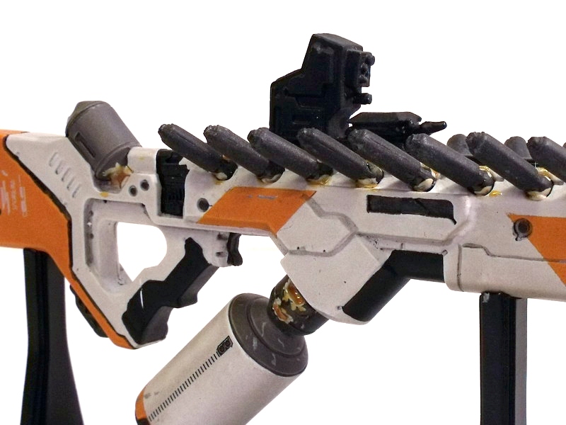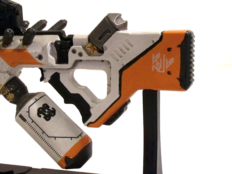 My excitement building, I carefully removed the replica to behold its beauty. Like many fans, the Arc Generator is my absolute favorite District 9 weapon... but the Assault Rifle runs a VERY close second. The design screams rapid fire death with its long straight barrel and vast array of protruding (ammo?) canisters. Like the Arc Generator, it is the Assault Rifle's color scheme that immediately grabs me: an eye-catching use of white, black and orange. The color contrast is pitch perfect and lends the weapon a very clean, futuristic, high-tech look.