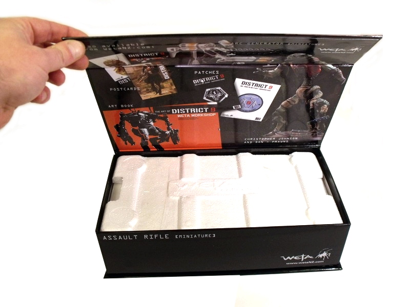 When my package arrived all doubts of this being some light, cheap tin toy were quickly erased: the Assault Rifle box weighed a ton! Well not an actual ton, but it certainly surprised me on how heavy it was. 2.6 pounds is what Weta's website states and that sounds about right. Packed safe in a Styrofoam-lined cardboard box you'll find a white mailer box which in turn protects the Assault Rifle's actual case. I say "case" because this is a really slick package that you won't want to throw away. It took me a little while to figure out how to open it, but was shocked when I learned that the top flips open via a magnetic flap. Classy. Inside you'll find the weapon stowed inside a Styrofoam clamshell with twisty ties used as an extra precaution. Adorned with great images of the weapon inside and informative text on the back, the District 9 Assault Rifle's packaging is an excellent presentation and ideal for future storage. You know you have something good when so much work goes into the product's box.