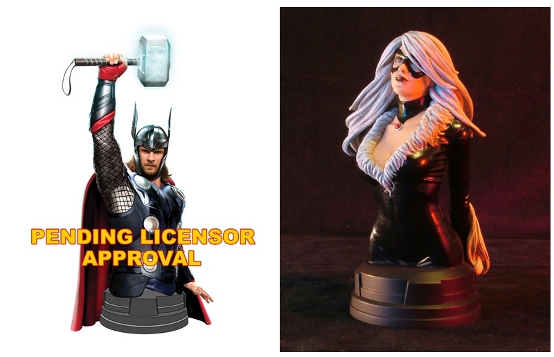 Coming soon are Deadpool on his Motorbike (prototype pictured above), interchangeable bookends allowing you to choose which hero battles which, and an ongoing line of mini-busts featuring all your favorite heroes, includign their first two releases movie Thor and Black Cat (below).