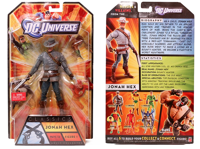 Up first is the bounty hunter Jonah Hex, and Gotham City’s The Creeper, and The Riddler. The packaging for Wave 16 is an all-new design, reflecting changes requested by retailers (think Wal-Mart) for a slimmer and taller card. The changes were also done as a running change anyway as it is no longer the 75th anniversary of DC Comics. Either way, I think it’s a great look and direction for the line while using the familiar colors of DCUC past. The back of the card still features the familiar bio and stats and a look at the rest of the wave.