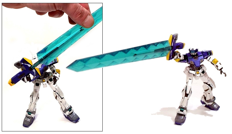 The Temjin also radiates awesome with its trademark weapon: the Multipurpose Beam Launcher. This blade-like weapon serves double duty as a rifle and energy sword, the latter which can be "powered up" with a HUGE attachable energy blade. Measuring 8 inches long, the translucent blue "blade" slides firmly over top of the Beam Launcher for a great alternative look. Unfortunately, the attached blade proves to be a little too heavy for the Temjin to hold properily; the mighty attachment causing the figure to lean forward.