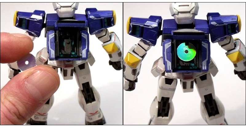 One cool characteristic is the protruding backpack that holds his VR disc (and to watch blu-ray movies, I'm sure). Bandai went to a lot of trouble getting this element on the Temjin right by building the device so it actually works. No, it doesn't play silly, but it does star a relatively complex mechansim that allows you to place the tiny disc in and have it pop out when the lid is open. Small details like this simply astound me on a toy.