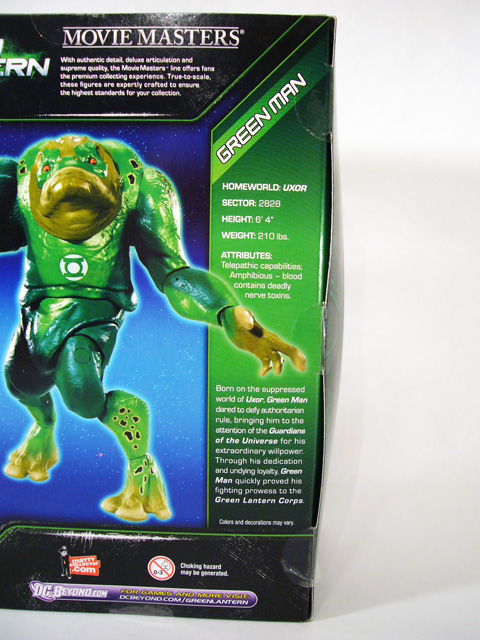 Green Man (and most likely the future release of Kilowog) will arrive at your door in a sturdy outer box that has the figure’s name and the movie logo. Within, you’ll see that Green Man gets an oversized box instead of a card and bubble. The overall design is the same, but with the full box Mattel was able to create even more of that familiar shape with a great mix of angles and arcs. The back of Green Man’s box has the standard Movie Masters description along with a large image, brief bio, and statistical information on the mighty alien.