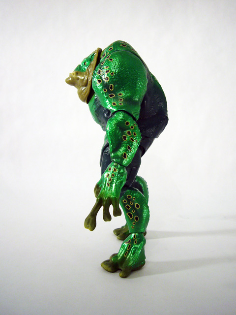 What’s really cool are all of the yellow-rimmed black spots on Green Man’s limbs, and the non-bordered bleed of uniform energy onto his bare hands and feet; these places are where the paint job really shines. Green Man’s head is a muddled drab green decorated with pale lips, a metallic green mask, orange eyes and nostrils, and a pattern of bio-luminescent spots.
