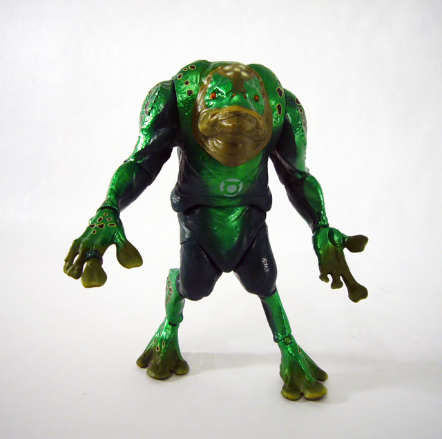 Green Man is big, real big. Standing 7 inches tall, this behemoth is in scale with the other Movie Masters figures! He’s an excellent example of an alternatively designed humanoid in toy form with an interesting body shape and unique limbs. The sculpt really helps sell the alien in Green Man. Besides being big and lumpy, the GL’s skin is entirely irregular with a bumpy texture. Limbs are bulky yet curvy, with unnatural shapes and a weird musculature that challenges the eye. Green Man’s unique hands have long and thick paddle-like fingers, and on the right hand is a great sculpted Green Lantern ring. His legs too are otherworldly with their conical feet ending it large padded “toes” like an elephant’s. Green Man’s head, really just a protruding face, is strongly frog-like with wide set round eyes, thick lips, and sagging jowl. Viewed from the side, the alien’s profile is profoundly angled from his forehead to his chin, with only nostrils to delineate his nose.
