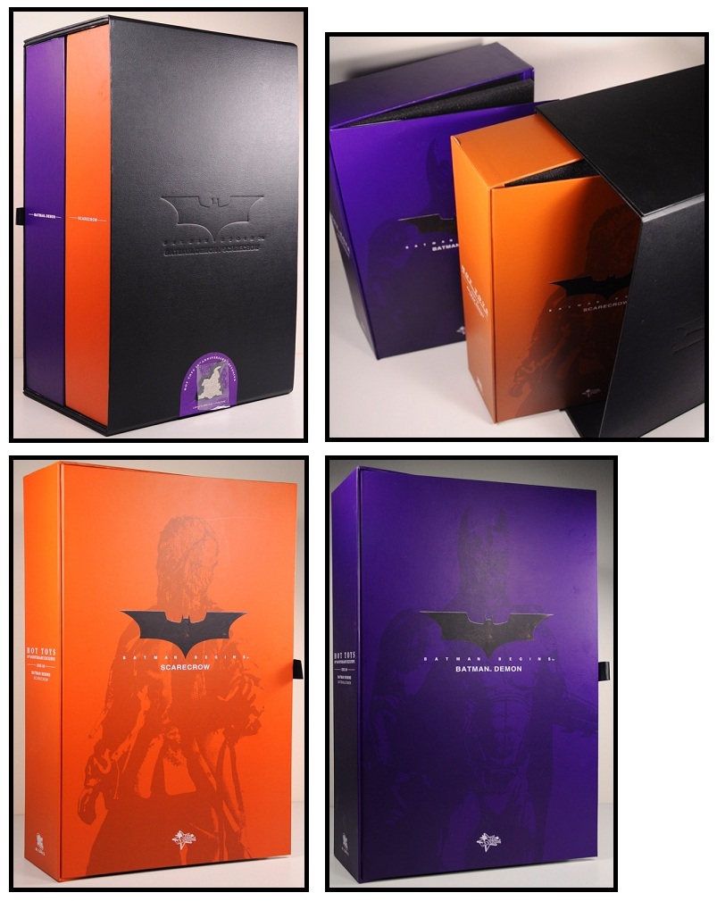 When you remove the outer slipcase, you discover the classic DC comics style city landscape printed inside the box. One will also find Hot Toys has picked purple as the main color for the Demon Batman box, whereas brown is the main color for the Scarecrow box. Both boxes are quite simple yet elegant with has portrait on the front part with some texts and the Batman Begins logo. And behind the box it is printed with the credits for the creative team. As for each figure inside the box, it is packaged with foam pieces wrapped according to the shape of the figure precisely to ensure easy shipping.