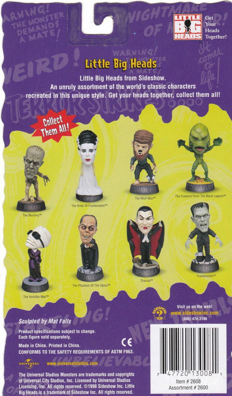 Before their extensive 8" Universal Monsters series, Sideshow Toys rolled out the classic creatures in their adorable "Little Big Head" format. Measuring 2 inches tall, the line borrowed heavily from Japan's popular super deformed figures - each character sculpted as a caricature of itself with itty bitty limbs, small body and, well, a big head. The Universal Monster Little Big Heads were a huge hit, spawning numerous waves in both full color and retro black and white, in addition to various exclusives and silly side lines, such as Monster Shredders. Pictured is the series that started it all.