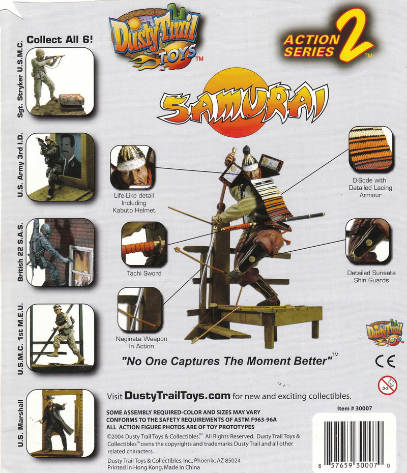 This series of figures from Dusty Trail Toys focused on capturing great warriors throughout time in dynamic action poses. The figures lacked articulation, but their excellent sculpts more than made up for it. Pictured is the Card Back for one of my favorites from Series 2 - The Samurai. With one foot planted firmly on the ground, the figure flows with eye-grabbing energy, deflecting a hail of arrows with his spear. Speaking of arrows, Dusty Trails provided extras (some full, some broken) with this figure for placing on the bridge base as you saw fit. Shame this line didn't resonate louder with collectors, some cool ideas were planned, such as a Huey gunship gunner.