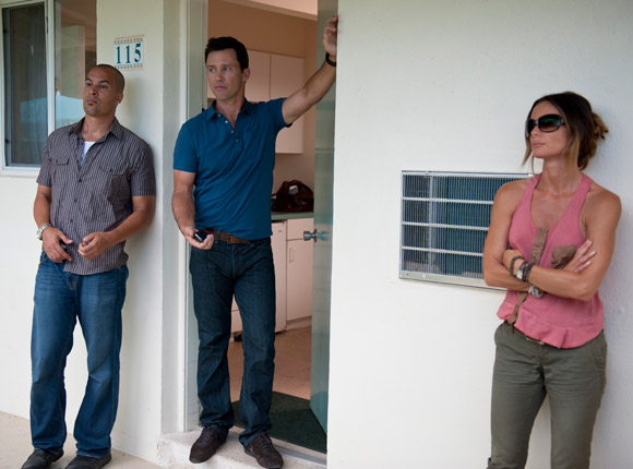* Speaking of returning characters, bumbling FBI agents Harris and Lane star in "Center of the Storm," an episode that not only shows the flip side of sunny Florida in the aftermath of a hurricane, but packs some great action with a former soldier turned hitman.