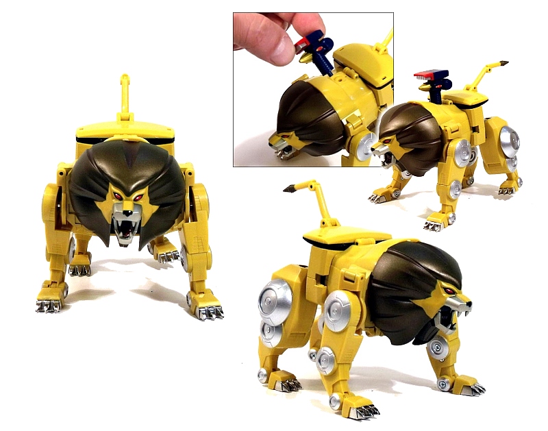 Finally we come to main attraction, the fully transformed Daltanious! Hasbro Transformer fanatics will absolutely have a blast converting the three modes into this towering toy. Transformation is not too challenging, but there is so much going on that it'll keep you raptly entertained. Morphing Atlaus is the initial step. Flip around his legs and fold them up around his chest, the latter which splits open wide to accommodate them. Atlaus' small head pops off as well, to be replaced with a much larger version (sans the removeable ship ability). Next, Beralios balls all up to form the torso. His head flips down to form the lion crest on Daltanious, the front legs compress and become part of Daltanious' back, while the lion's back legs stiffen out to become anchors for the main legs, Gunper.