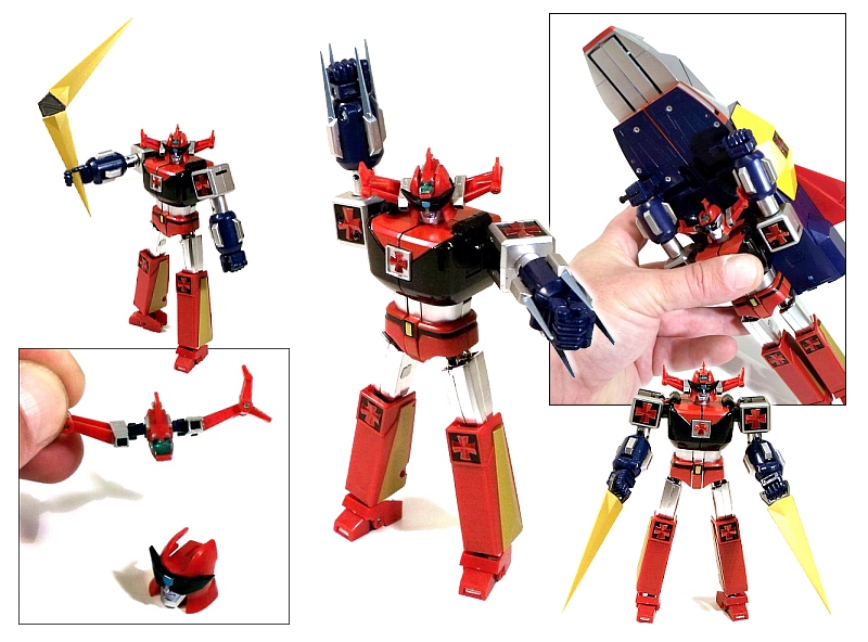 Before we get to that fully transformed state that is Daltanious, we must explore his many modes. First up is the smaller robot Atlaus - the leader of the Super Robot team. Like a minature version of the combined 12-inch tall Super Robot, Atlaus stands proud at close to 6 inches and packs some incredible die-cast content. This robot reminds me a lot of my old Shogun Warrior toys in size and construction and I got a warm, fuzzy nostalgic feeling while playing around with him. And wait until you do play around with him! There are so many layers to Daltanious and his individual modes that it's like peeling back an onion of awesomeness. For Atlaus you have multiple weapon attachments. These include two spiked hand-held blades that can also be combined to form a powerful boomerang. Then there's his arms. Each silver nub on his gauntled arms pops off and can be replaced with protruding spikes called "Hand Slicers". There's even a surprise in his head! As mentioned at the beginning of my review, Atlaus features a removable micro command ship, very similar to Mazinger Z. With a few twists of the wings (yes, even the small ship transforms!), the shuttle can be inserted into Atlaus' noggin for piloting the robot, or removed for roving around on its own. Now imagine a human pilot behind the wheel of that tiny ship and you get a clearer idea how large Daltanious would be - fully formed - in real life. COLOSSAL!