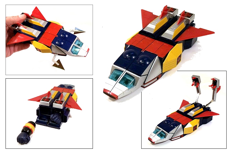 Pushing on through the twisting maze of Daltanious delights we reach Gunper, a sleek spaceship. At first glance, the Gunper may look simple in appearance, but the craft actually comes loaded with well concealed action gimmicks. First, slide out the two hidden bars below the vehicle and attach the two included silver blades. Presto! Instant slice and dice machine! Lifting back the dorsal fin panels reveals another secret defense, two extremely possable grappling claws. Each finger even articulates! Next, the two thruster panels can flip down and Daltanious' power fists can be stowed away for later use. Or you can pretend to launch them for a devastating rear attack. Last, but not least are two handle bars that pop out from below and reattached in their appointed slots. This allows Atlaus to grab on to them and use the Gunper as super rocket transportation.
