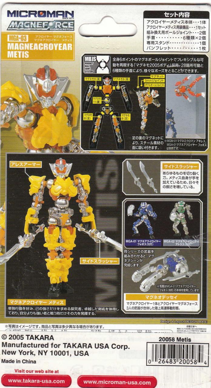 I had my first Microman experience with the 1970's U.S. toy line it inspired, the wonderful world of the Micronauts. And while most U.S. collectors are infinitely more familiar with the Micronauts, Microman remains a mainstay in Japan, even though its popularity (and identity) has fluxed greatly over the years. I found this cool Acroyear at my local Five Below, for, you guessed it, $5. How could I resist? Part of 2005's MagneForce series, this figure harkens back to Microman's golden years in both look and function; Microman's trademark interchangeability modernized with cool magnetic limbs.