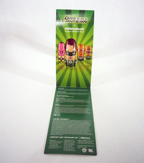 The four members of the Green Lantern x MIMOBOT collection come packaged in the same basic box, a sleek and fun window box. Tall and narrow, these MIMOBOT boxes are boldly green with a pattern of Green Lantern logos in the background. Surrounded by a MIMOBOT silhouette cutout the individual characters are visible on the left side of the front panel, surrounded by the Green Lantern logo, the storage capacity, the MIMOBOT logo, and the character’s name. The DC Universe logo adorns the very top. The back of each box has a brief announcement about the partnership between Mimoco and DC Comics along with images of each drive and a handful of other available characters.
