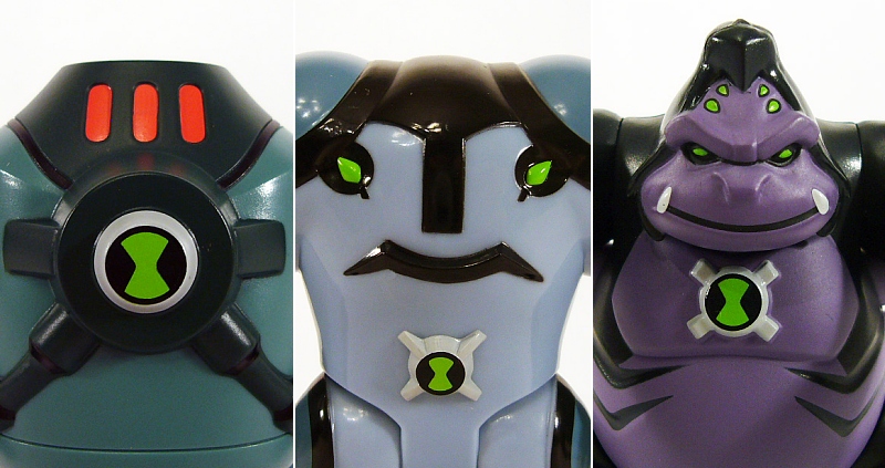 Along with their unique appearances, each Ben 10 alien has its own distinct color palette, and that’s captured in the toys just like in the show. NRG is green upon green in two different alternating shades that add to his industrial look, and the bright green of the Ultimatrix logo and the red of his eye vents are very eye-catching against the drab background. Ultimate Cannonbolt trades in the basic white and yellow for a two-toned blue steel look that’s lighter on his underbelly and darker on the armored plates and spines. Black divides the sections and shows up on his wicked claws while the Ultimatrix and his eyes glow bright green. Ultimate Spidermonkey also differs from his original form’s colors (mainly light blue) with an overall black and purple palette. The ubiquitous green eyes (all six of them!) and Ultimatrix are there as well, and white pops up on the alien’s tusks. All three look very show accurate and will be immediately recognizable to viewers.