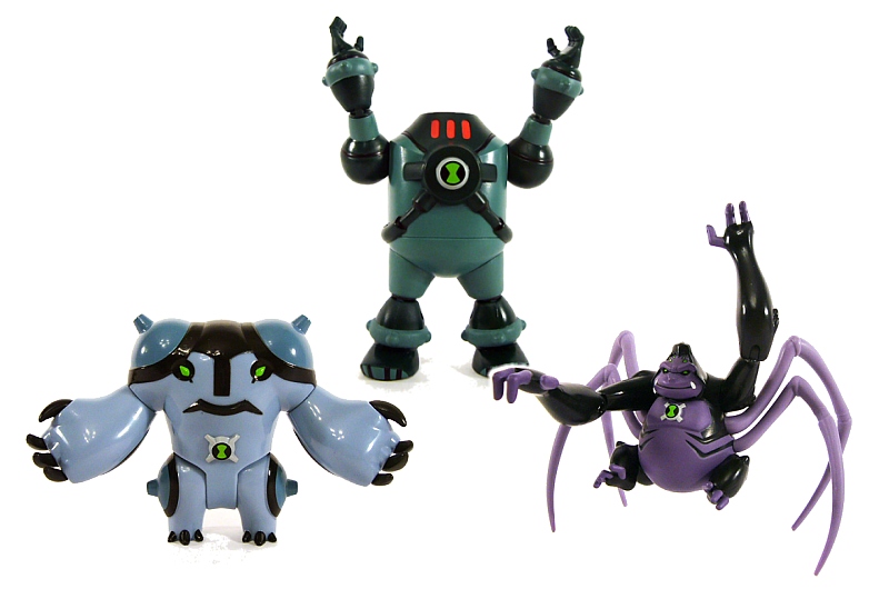 Since the beginning the Ben 10 4 inch line has focused mainly on the show’s heroic Omnitrix (then Ultimatrix) aliens. That hasn’t changed, and now joining the basic aliens are also cool new “ultimate” versions. Of course, Ben’s Ultimatrix continues to add new alien DNA codes to its database as well. Among those is the enigmatic NRG, a radioactive alien entirely contained within a suit of impenetrable armor. Building on previous forms are Ultimate Cannonbolt and Ultimate Spidermonkey, a spiky version of the wrecking ball alien and a gorilla-like upgrade to the six-armed arachno-simian respectively. All three of these show up quite frequently on the TV show, making them perfect inclusions for the line.