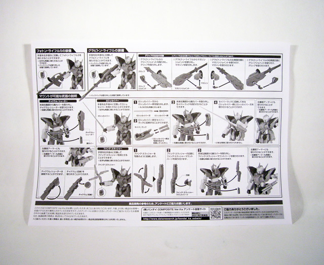 The packaging for the Composite Ver. Ka series is similar to that used on the Robot Spirits, just bigger and more visually appealing. The front panel has a huge window that reveals the figure and some of its accessories, along with an image of the Exbein off to the side. In front of the figure is printed its name, the series where it comes from, and the Ver. Ka title. The back of the box has tons of cool imagery featuring the Exbein in physical and animated versions utilizing all of its weaponry in cool poses. There’s also a whole bunch of Japanese flavor text if you can read it. Finally, the back panel notes the man behind the mechanic design: Hajime Katoki! Inside the package you’ll find two trays of parts, an instruction sheet, and a unique “sign” that you can use as a backdrop or file card.
