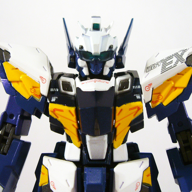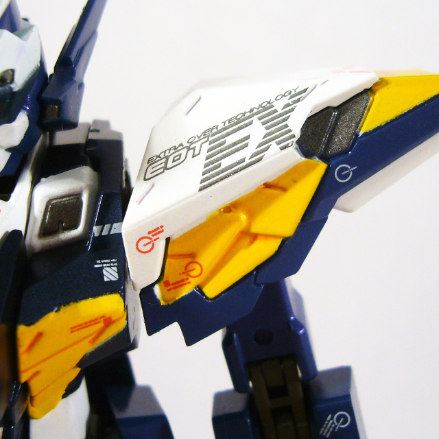 The other cool thing about the Exbein is its color scheme. Many of the giant robot toys are primarily white, with the occasional red, black, or other colors. The Exbein is an overall dark blue with a metallic sheen that’s sure to pop against a sea of generic-looking robots. Even better, its secondary colors are bright white and a yellow/orange giving you the light and dark contrast. The white shows up on knees, forearms, torso, shoulders, and head, with yellow around the same areas and down the legs. Like other Composite Ver. Ka robots the Exbein has lots of decal-like imagery including minute red warning signs, white logos, and a cool “Extra Over Technology” label on the left shoulder.