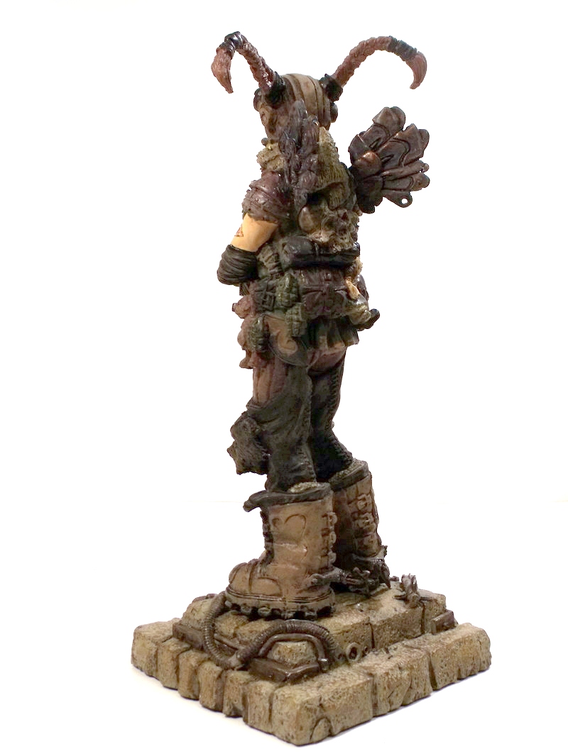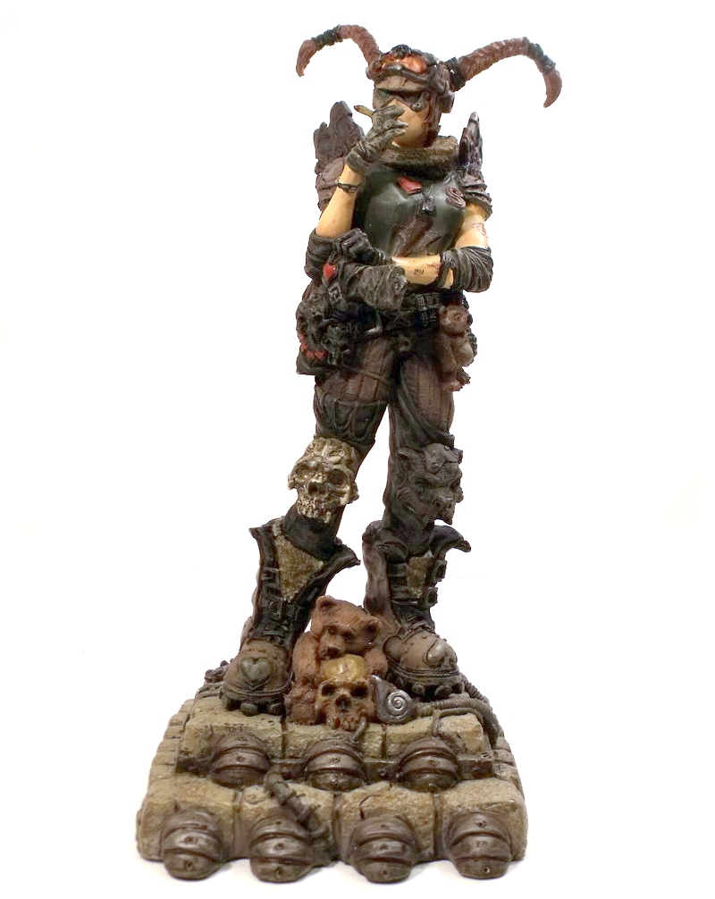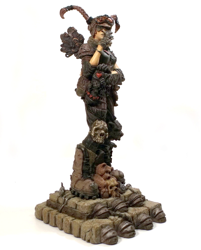 To help that imagination along, the Shiflett Brothers have infused many, many revealing details on this piece. It's these small elements that breath life and character into Chloe and make this statue a real knockout upon closer inspection. I mentioned earlier that she was a romantic and a dreamer. Hearts speak of love, wings display her love of flying. There's a little girl inside Chloe that hasn't grown up yet. She's a dreamer that longs for simplier times - playtime with her favorite dolly and teddy bear - items she still carries with her today. There's compassion in Chloe, she takes people where they need to go. However, with compassion comes caution. She's seen the darkness that the universe holds and always comes prepared. Her magnum is always at the ready. Knife and grenades just in case. She has used them all too, trophy skulls speak loud and clear of those stories (and arm tattooed "kill marks" help her to always remember them).