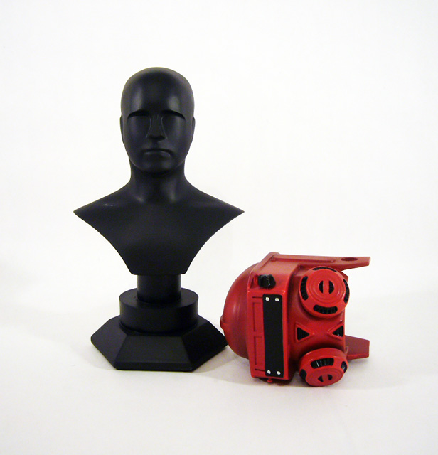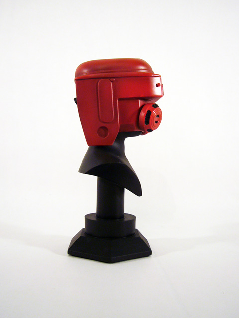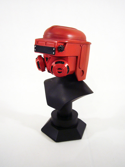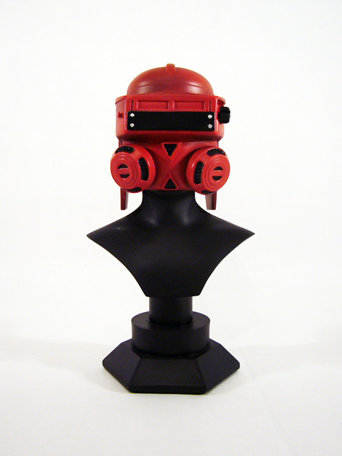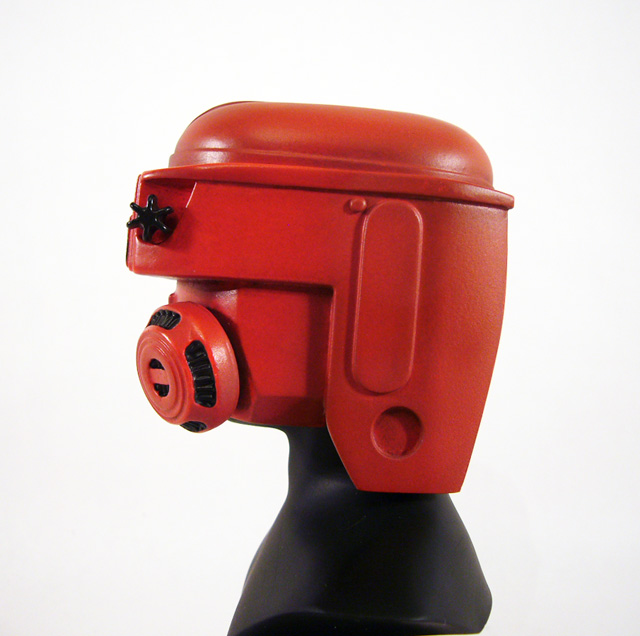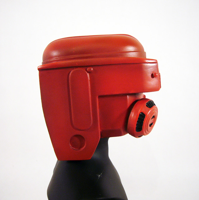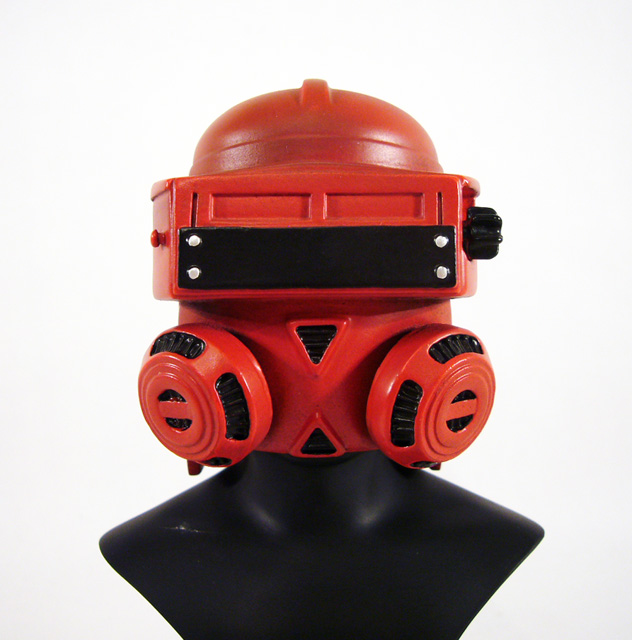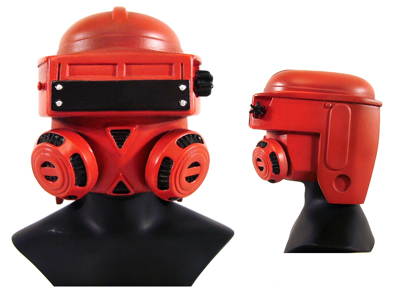 The Industrial Welding Mask is heavy duty protection for the most dangerous jobs. Instead of covering just the face it wraps around most of the head, only leaving a small part in the back exposed. The front is equipped with twin atmospheric filters on either side of the mouth area, and a heavy duty heat-shielded visor (with adjustment knob on the left). Add to that a bright fire engine red and black paint scheme and you’ve got a striking sci-fi prop.