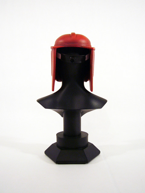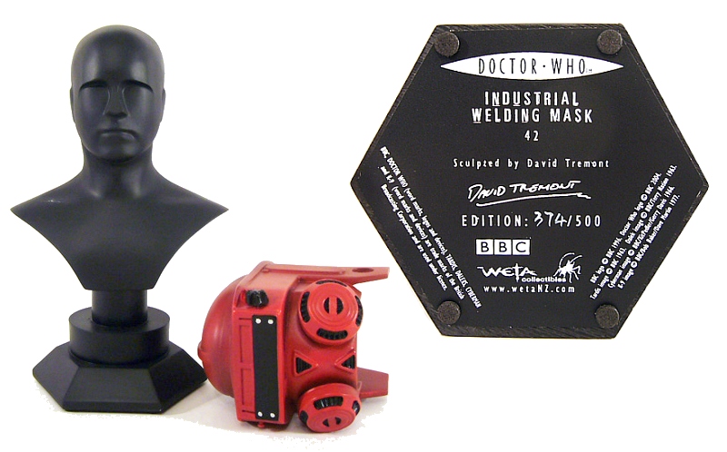 Weta’s miniature Industrial Welding Mask is a fantastic looking prop replica. Just taking it out of the box you can tell how much care and attention went into it. First off, it’s incredibly heavy for its size. At only three inches tall the cast metal mask by itself weighs nearly two pounds! Just like with Weta’s other miniature helmet lines (Lords of the Rings, etc.) the Doctor Who products come with model busts on which to mount them. The stand is about 6 ½ inches tall, a simple male head and torso made of black polystone on a hexagonal base. The bottom of the base has a bunch of information, a signature by sculptor David Tremont, and its individual number (out of 500). The mask fits snugly on the bust, and there’s built in padding so the top of the head doesn’t get scratched.