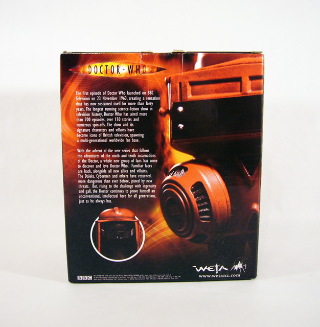 Weta’s miniature replica of the helmet comes to you in a very sleek box. Photos of the replica Welding Mask really pop over the black background and swirling red and yellow Doctor Who timestream patterns. The front panel is simple and sophisticated with a full frontal view of the helmet, its name in the bottom left corner, and logos for the show and Weta. One side panel shows the Mask’s profile, while the other has a close-up shot along with a description of the episode. The back of the box has an extreme close-up photo and rearview shot with a history of Doctor Who.