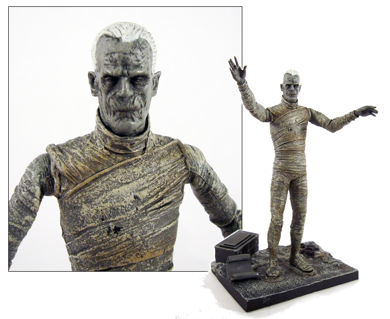 The oldest movie monster among this trio is the Mummy representing the titular character (also known as Imhotep) played by the great Boris Karloff in 1932. A mummified ancient Egyptian priest, Imhotep is accidentally brought back to life and seeks to resurrect his lover by any means necessary. The Mummy figure captures the monster from the most famous scene in which Karloff appears in full makeup and wrappings, only his head and hands exposed. The figure’s pose is interesting; not quite fully rejuvenated from the grave he lurches forward on uncertain legs, but his upper body is held erect and noble. Naturally, the sculpt is defined by amazingly intricate layers of ragged “cloth” strips with its own unique texture and the tightly wrapped thin limbs and body add to the fright appeal. The Mummy’s hands are desiccated with long, narrow fingers perfect for reaching out toward his intended victims, and on his right hand is sculpted Imhotep’s iconic ring. The head sculpt is a very good likeness of Karloff in the monster makeup.