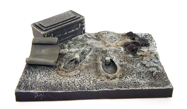 The Mummy stands on a display base that’s right out of an archaeologist’s dream, a dusty floor littered with broken pottery shards, a box, and the scroll that brought Imhotep back to life. The base plugs into holes on the bottom of the figure’s feet and he’s pretty stable on it. Both the figure and the base share the same coloring, a monochrome palette with a fair degree of yellowing that really looks great and “aged.” The Mummy’s skin is a deathly dark gray, his ring black, and his hair pure white. With articulation only at the neck, ball-jointed shoulders, and wrists he’s not going to be dancing a jig, but the Mummy looks good in a lumbering walk or reaching toward you.