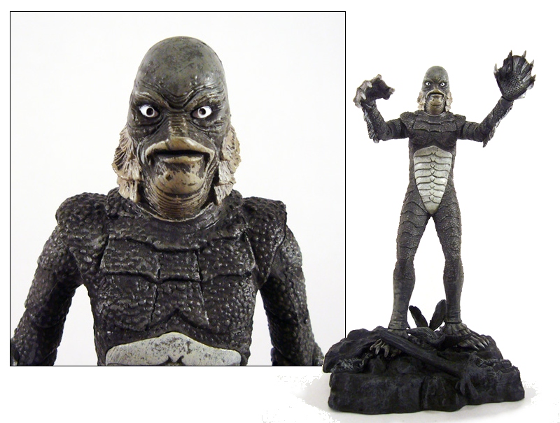 The inspiration may have come from decades old films, but these figures are great examples of top-notch craftsmanship. In the 7 inch scale they stand at approximately 7 ½ (Mummy), 8 (Creature), and 6 ¾ inches (Wolf Man). Like the other figures in Diamond’s Universal Monsters lineup, these three feature great sculpts that really bring the classic characters to life once again. And while they may not be super articulated, the monsters are captured in film-accurate poses made even better (and more authentic) by their included diorama display bases. Of course, what really set these figures apart are their awesome black and white cinema-inspired paint jobs!