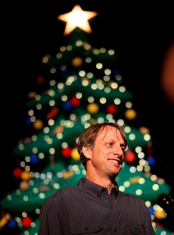 LEGOLAND, the family theme park in Carlsbad, created 50 new LEGO skateboard ornaments for its 30-foot tall LEGO Christmas tree in honor of skateboarding legend Tony Hawk. Hawk and two of his children pulled the switch that lit the world’s largest LEGO Christmas tree last night after he was presented with $10,000 for the Tony Hawk Foundation by LEGOLAND General Manager Peter Ronchetti.
